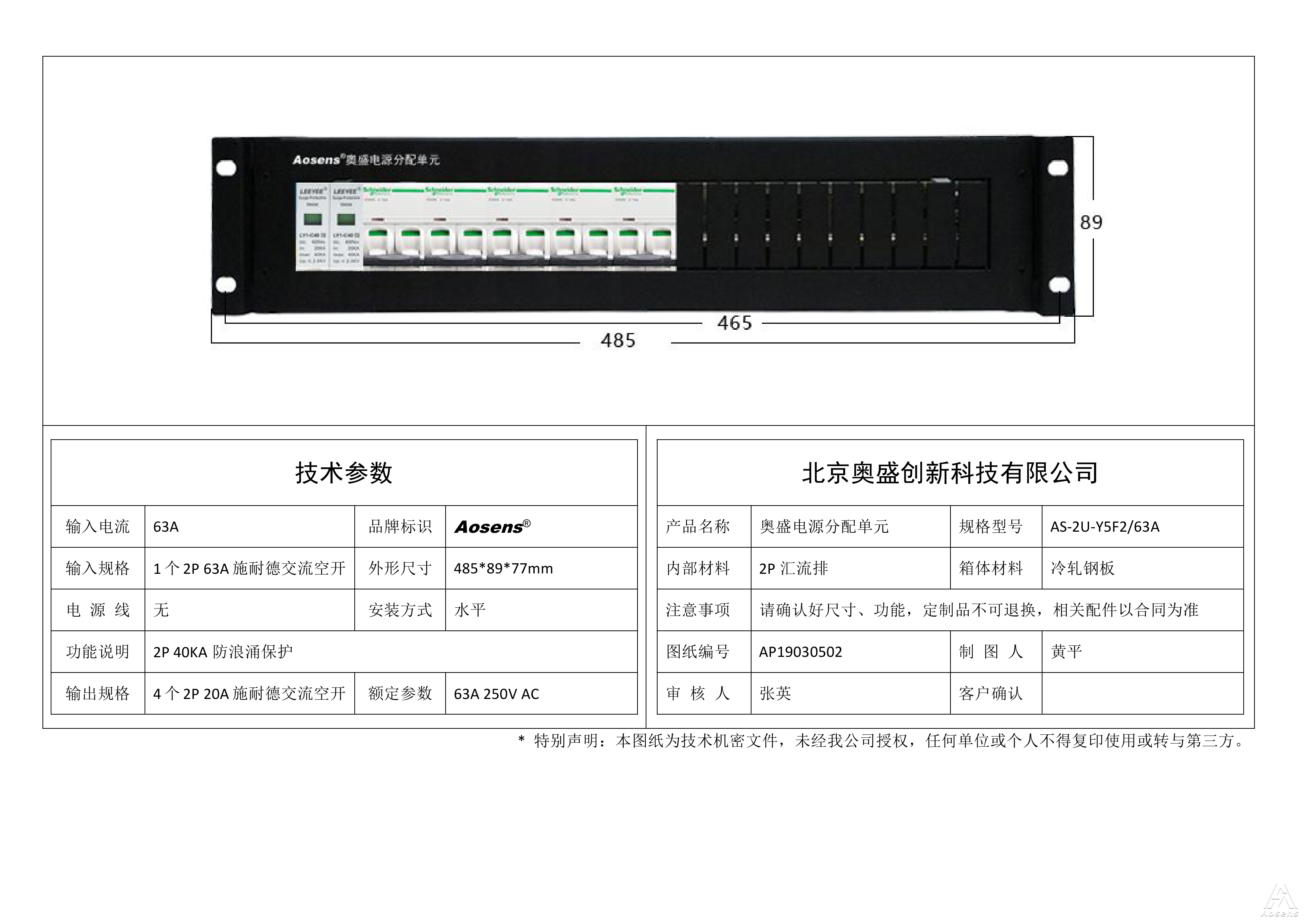 型号AS-2U-Y6/G63 参数63A 250V AC 输入无插头 , 无线 输出空开 功能过载保护,短路保护,欠压保护,总控开关 壳体2U钣金 安装19英寸横装