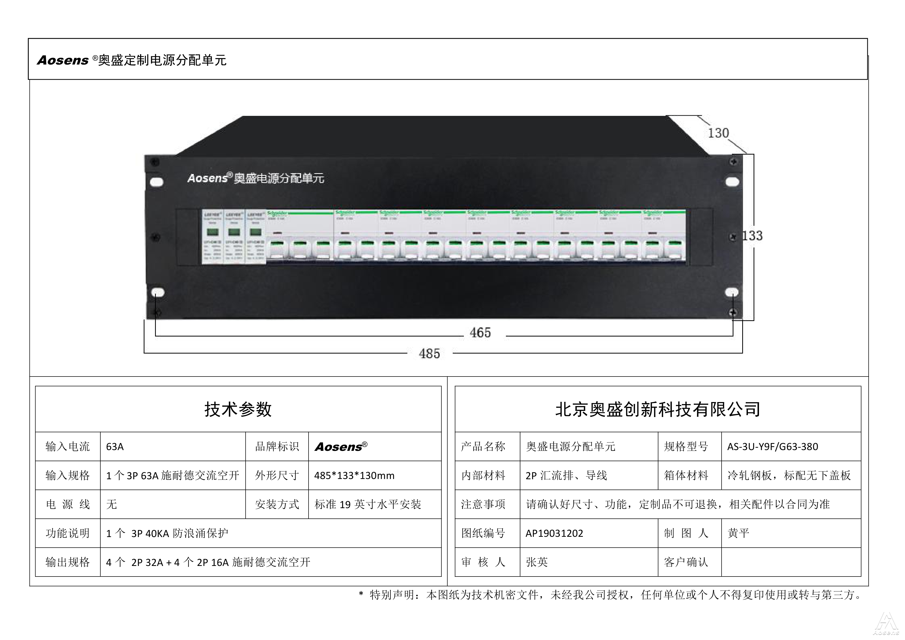 AS-3U-2Y4G32S 参数32A 250V AC 输入无插头 , 无线 输出空开 功能过载保护,短路保护,欠压保护,总控开关 壳体3U钣金 安装19英寸横装