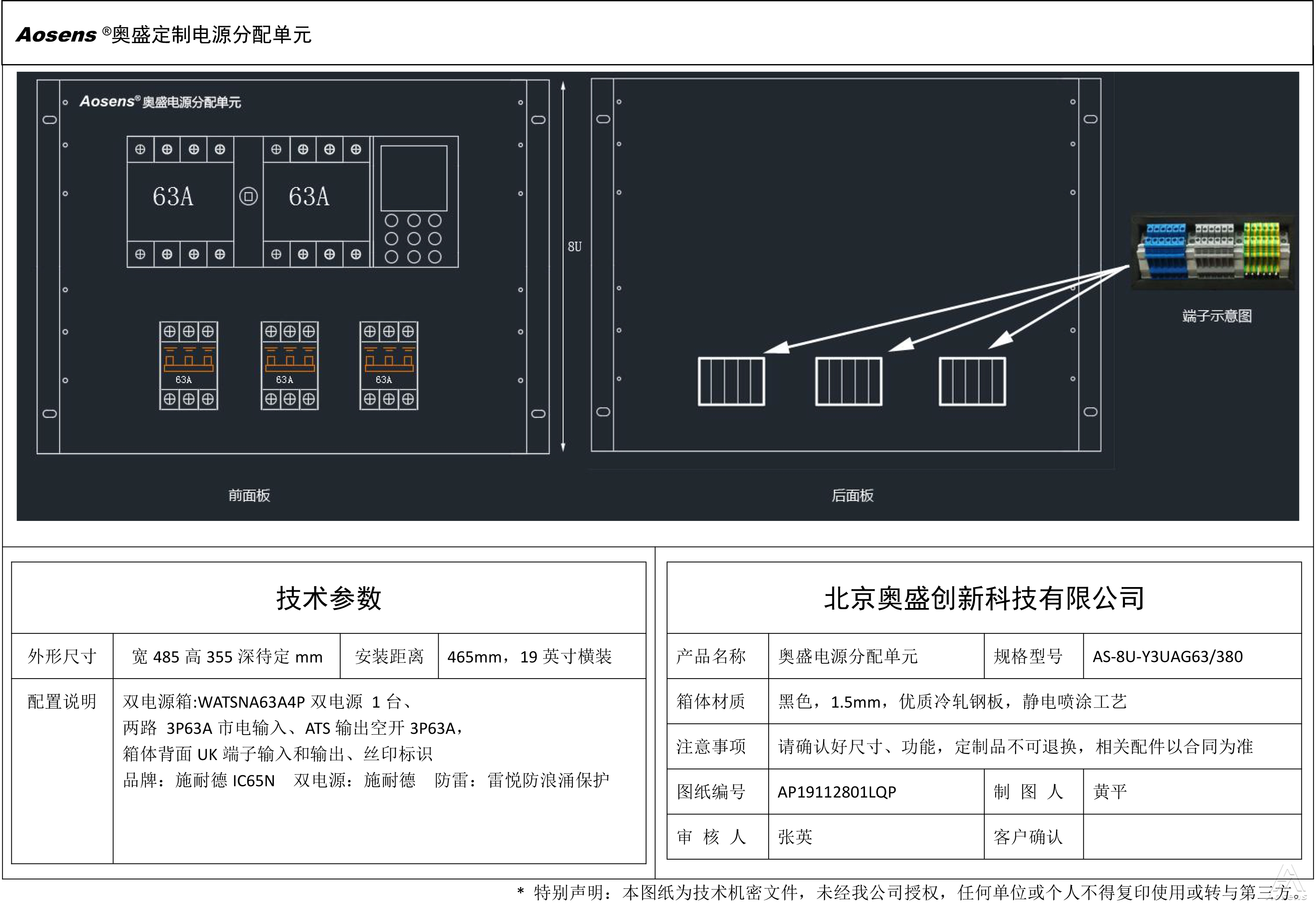 AS-6U-Y18FUG63/380 参数63A 380V AC 输入无插头 , 无线 输出端子,空开 功能SPD防雷保护,过载保护,短路保护 壳体6U钣金 安装19英寸横装