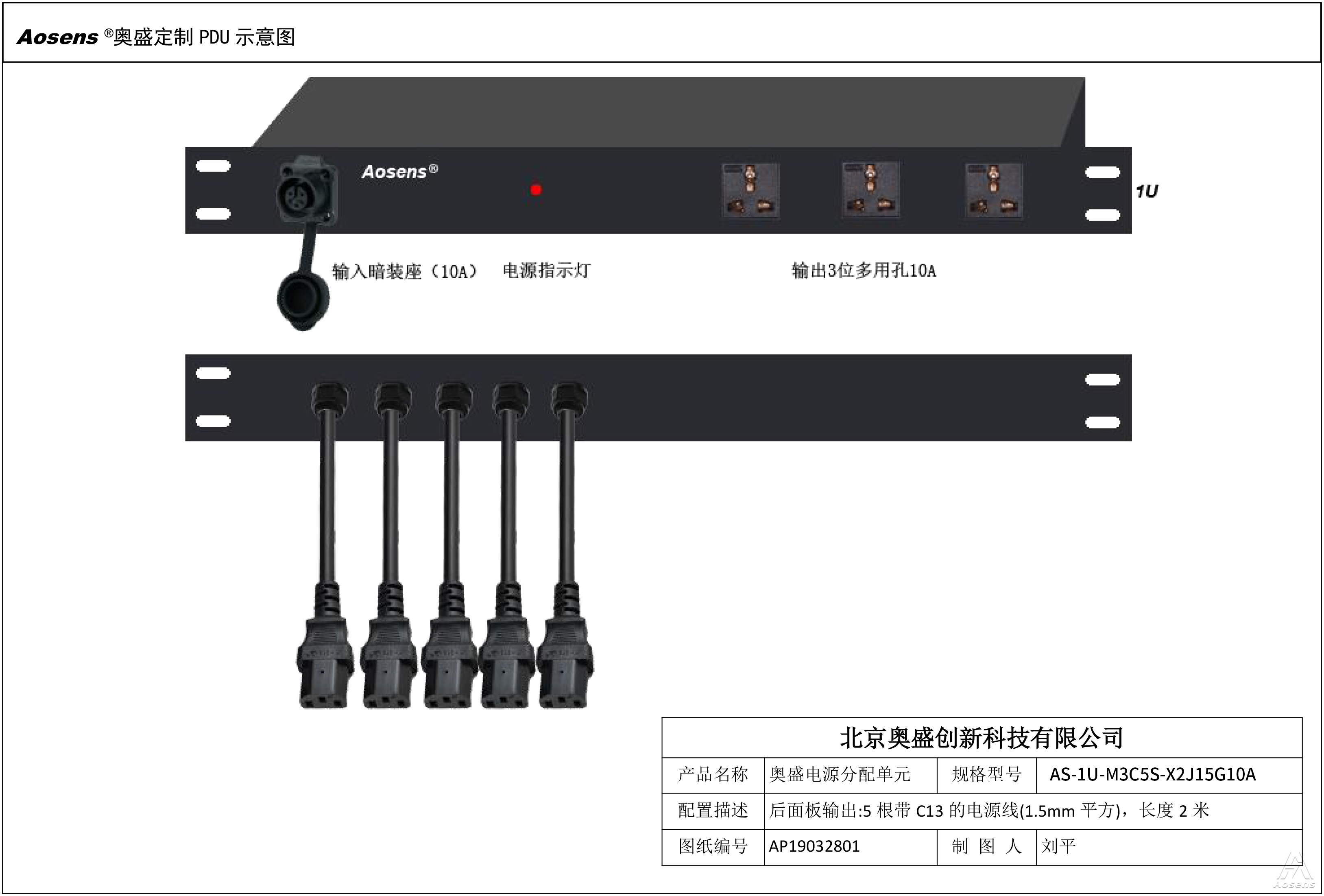 奥盛 PDU插座 10A国标五孔插座 指示灯前面板输出3位插座后面板输出5 根C13 的电源线