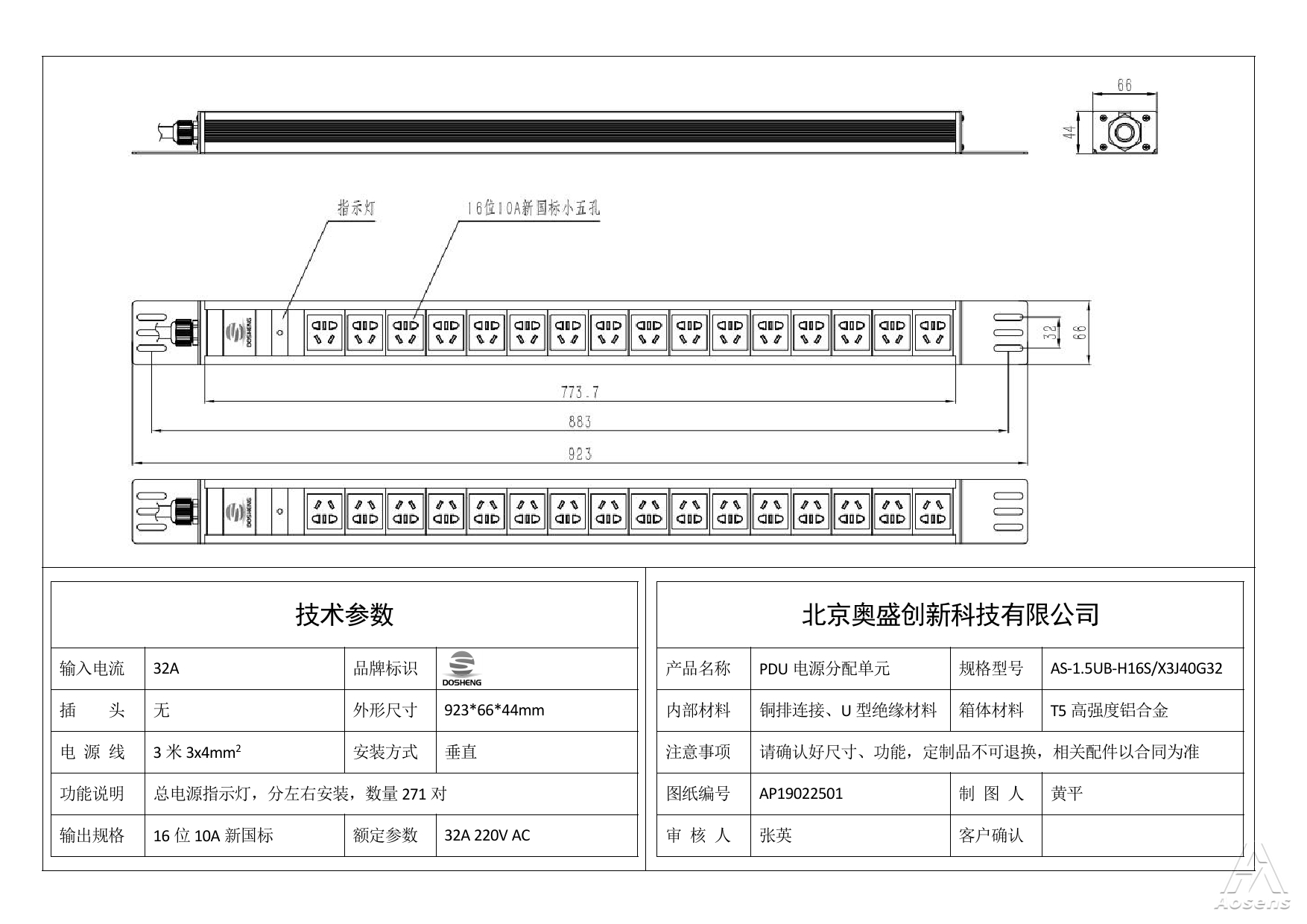 奥盛 19位PDU插座 16A+10A国标三孔插座 指示灯 配3米线无头