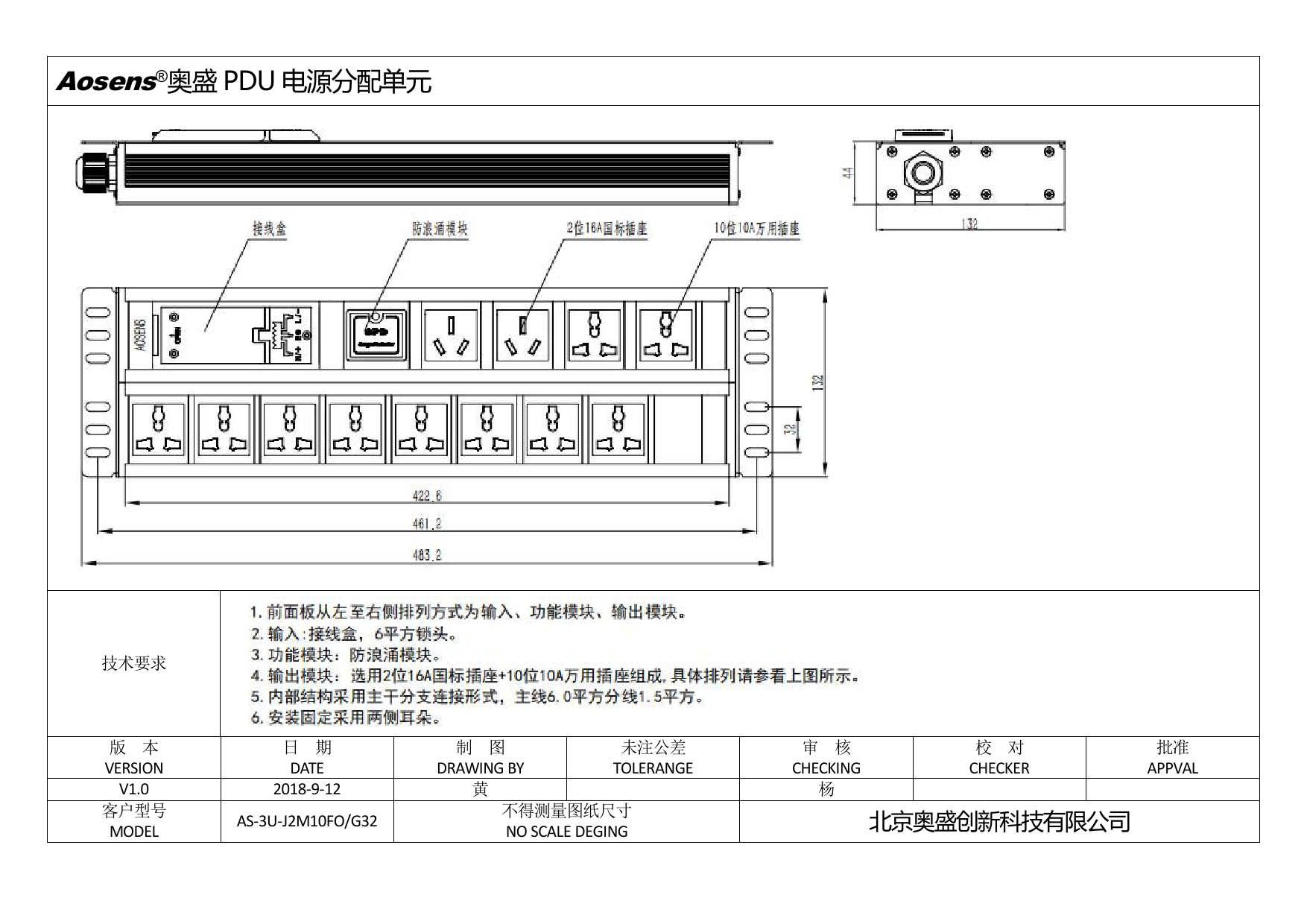 AS-3U-2Y4G32S 参数32A 250V AC 输入无插头 , 无线 输出空开 功能过载保护,短路保护,欠压保护,总控开关 壳体3U钣金 安装19英寸横装
