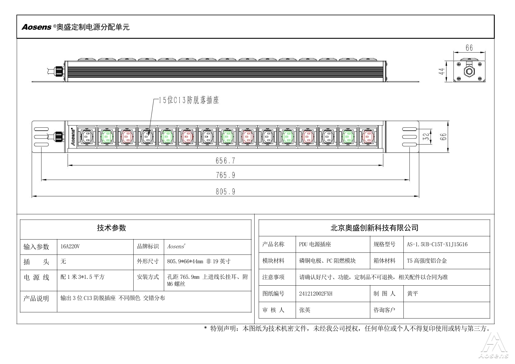 奥盛 15位PDU插座C13 彩色防脱插座16A 220V 1米线无头