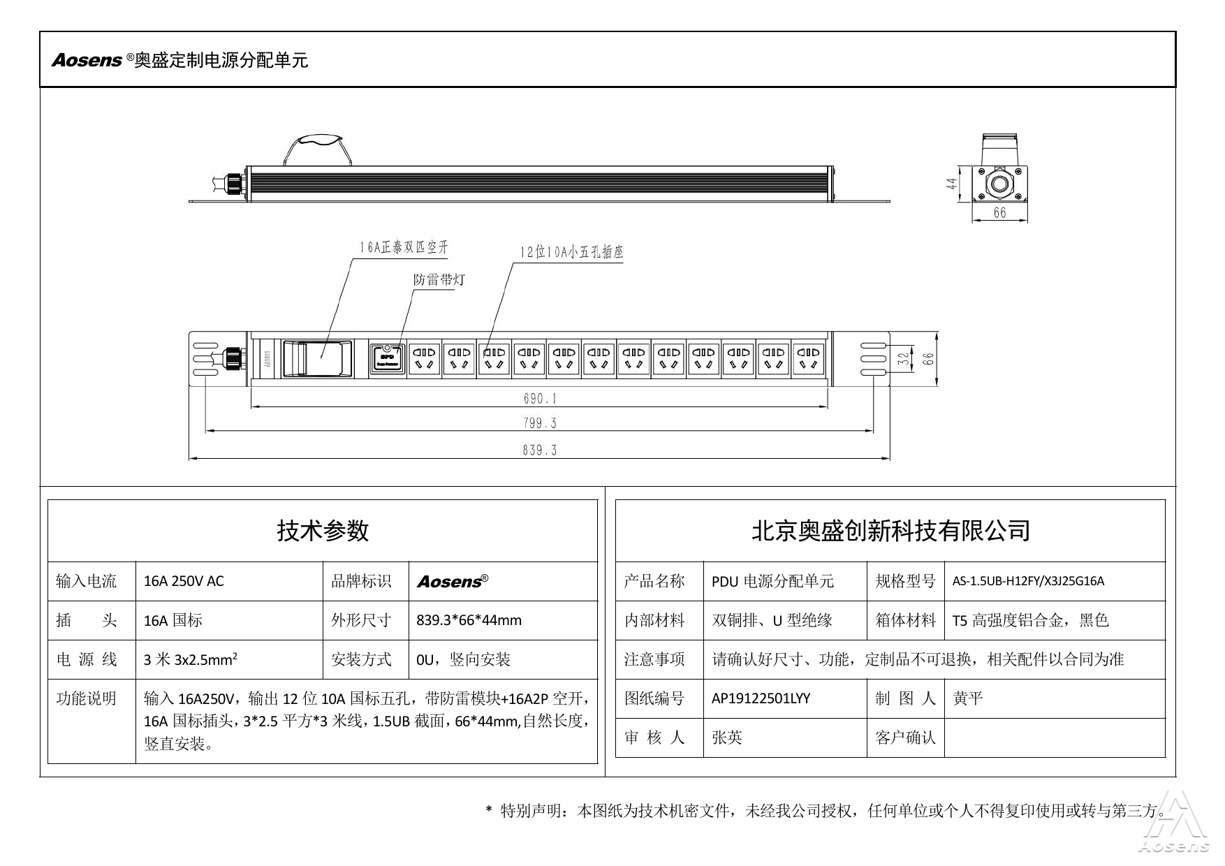 奥盛 19位PDU插座 16A+10A国标三孔插座 指示灯 配3米线无头