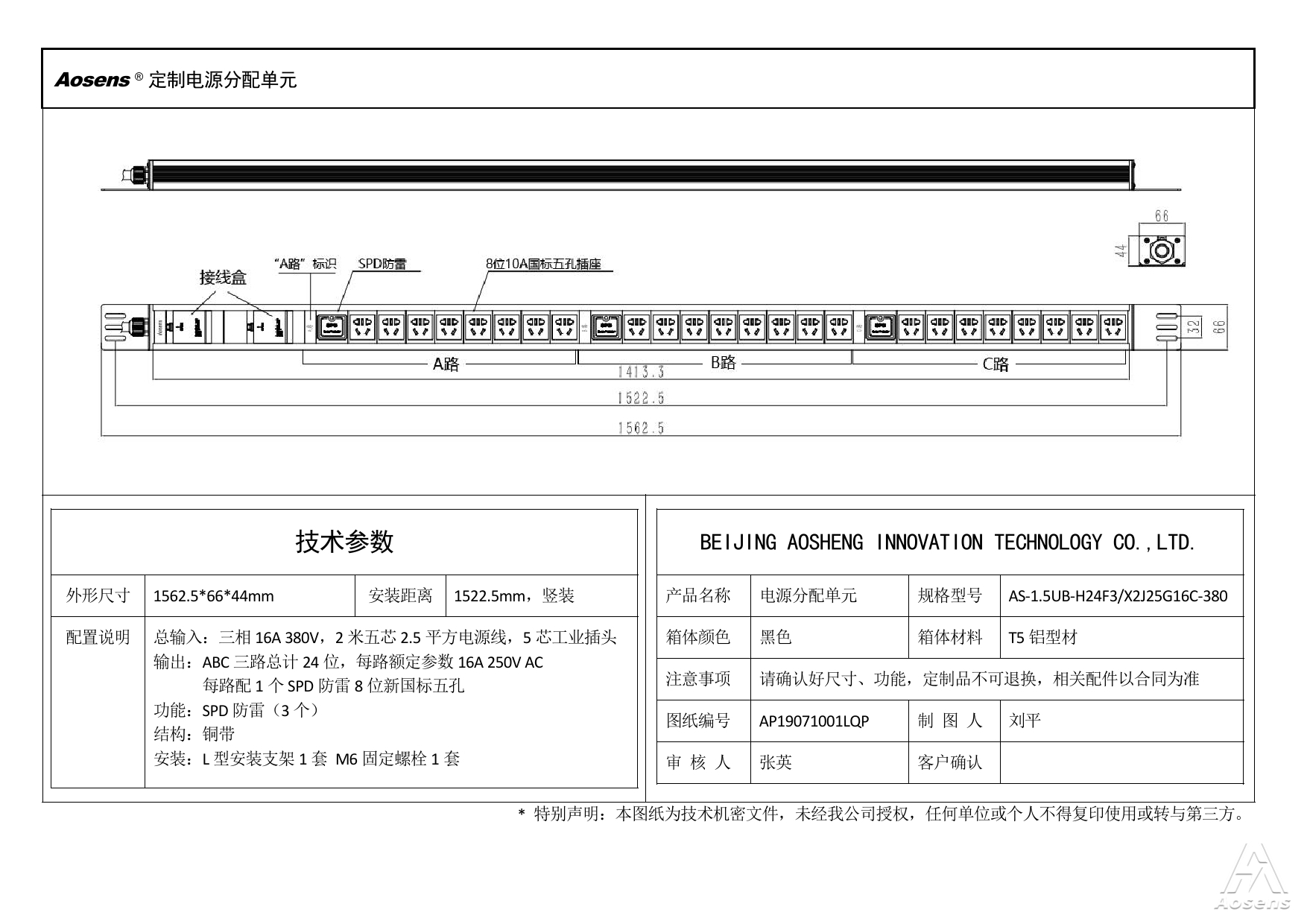 奥盛 24位PDU插座 三相 16A 380V ABC三路各8位新国标五孔+1位SPD 防雷 接线盒配 5芯工业插头